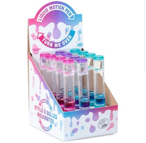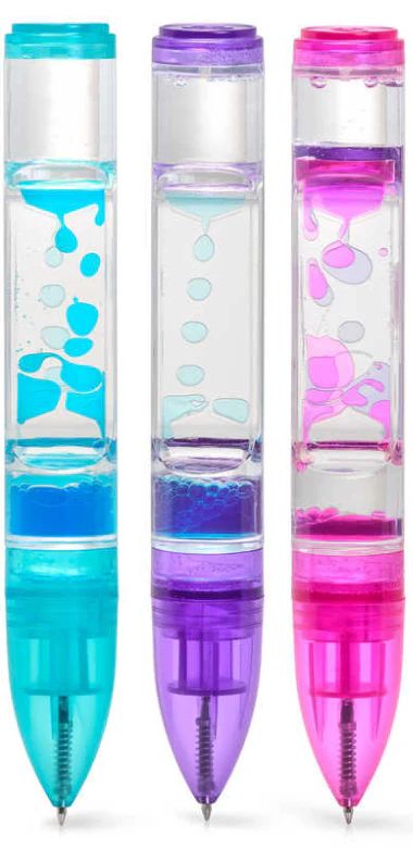 Assortiment de stylos anti-stress à mouvement liquide disponibles en 3 couleurs, bleu, rose et violet.