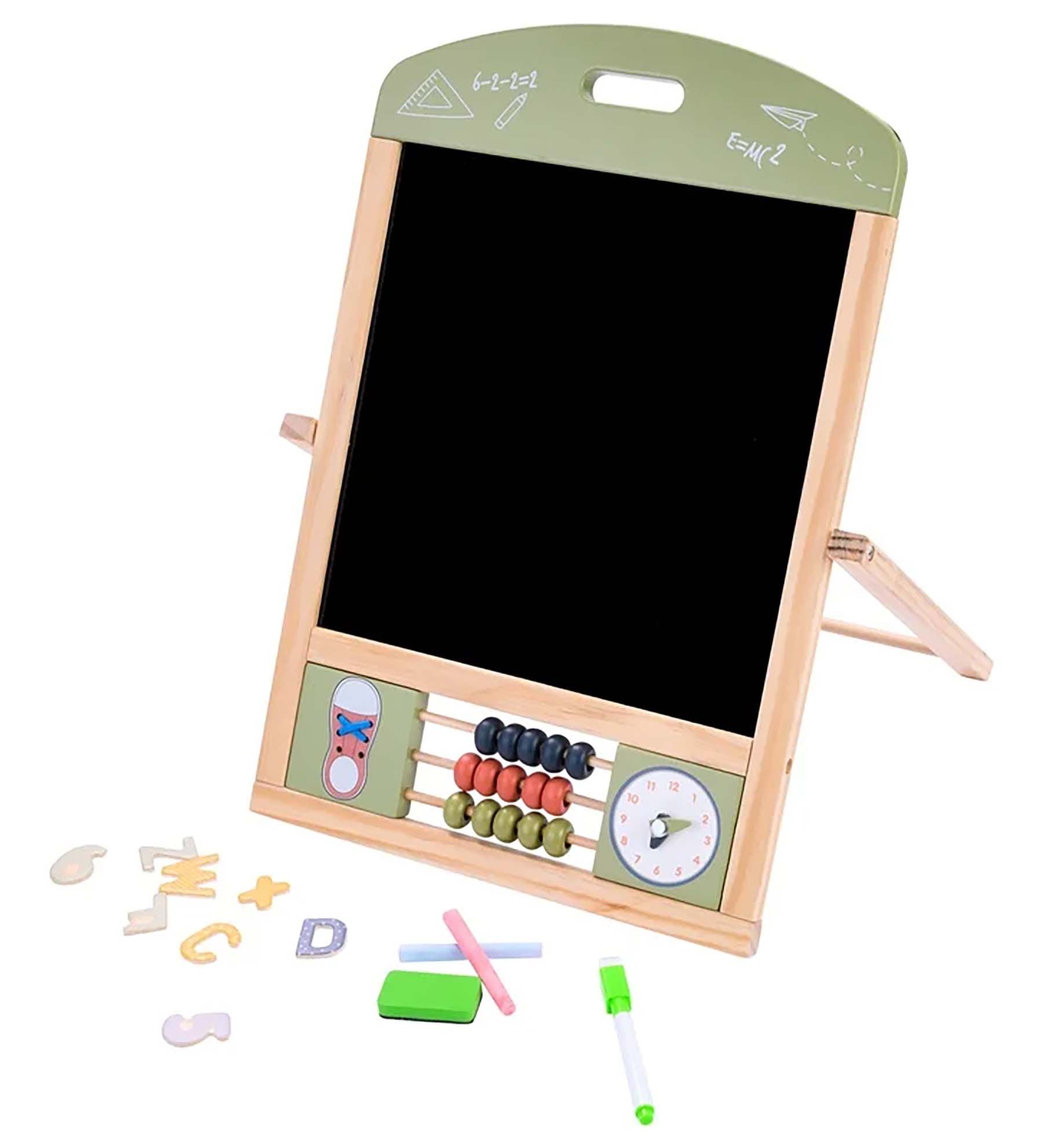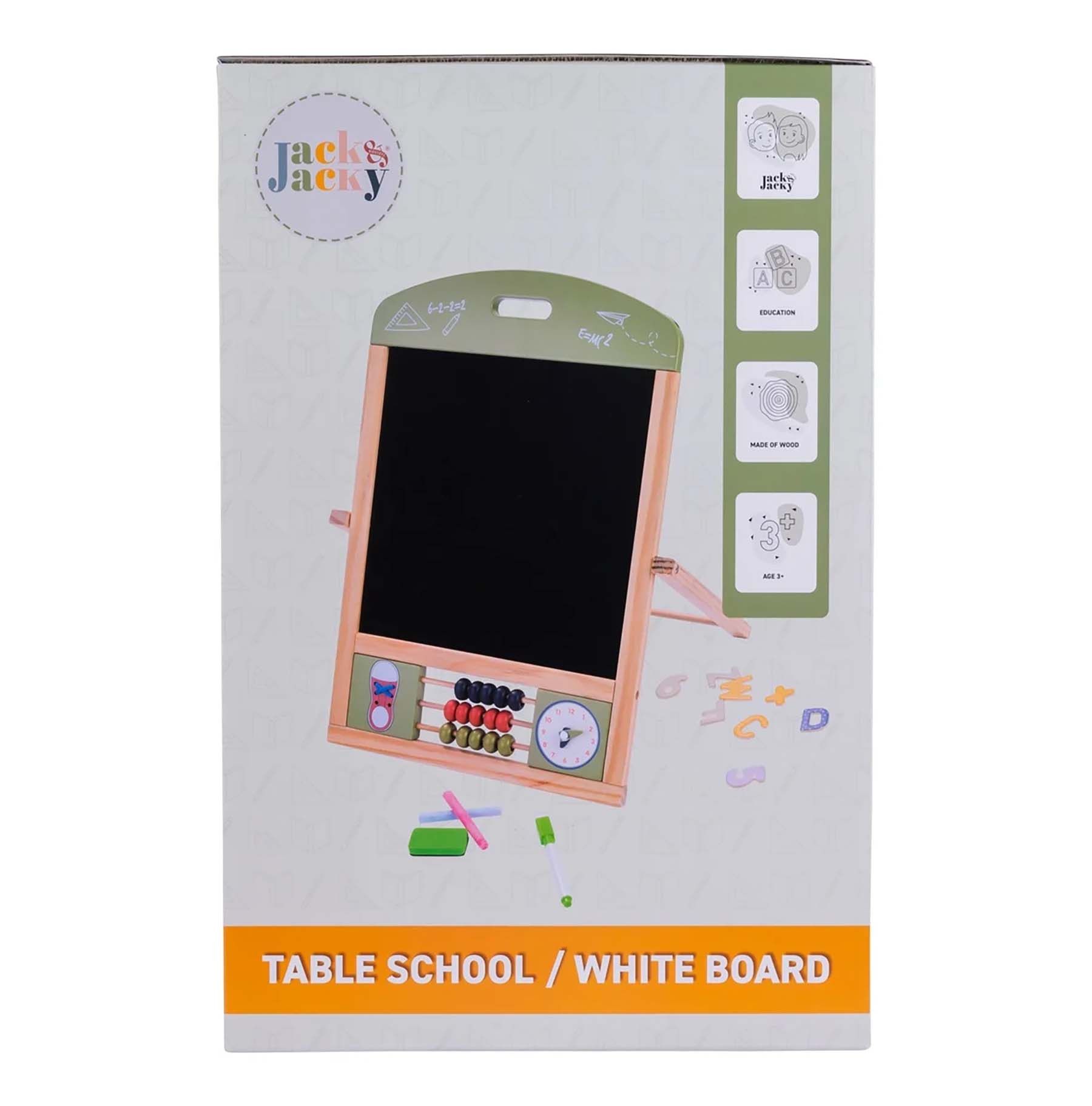 Découvrez ce tableau double face en bois de la marque Jack et Jacky. Avec ce tableau, les enfants peuvent s'amuser à faire des dessins sur le côté noir grâce aux craies incluses ou dessiner au marqueurs et collé des aimants sur le côté blanc magnétique.