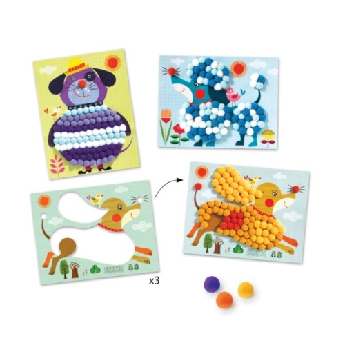 Les tableaux de pompons chiens à caresser de Djeco sont une activité manuelle avec de gros pompons colorés pour les enfants de 3 à 6 ans.