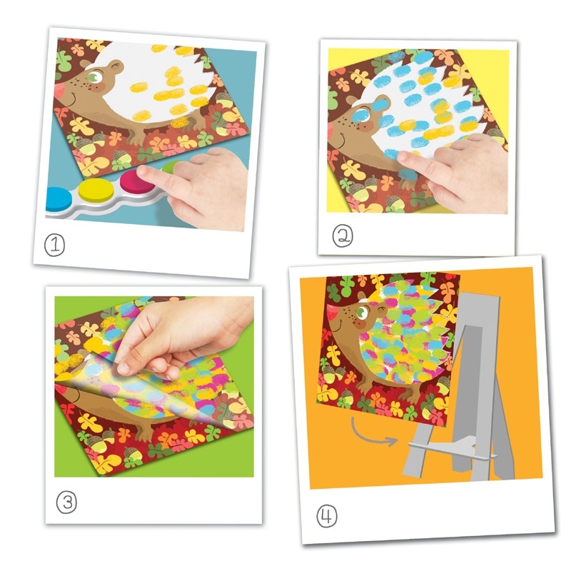 Contenu : 5 cartes, 4 encreurs de peinture à doigt et un chevalet.
