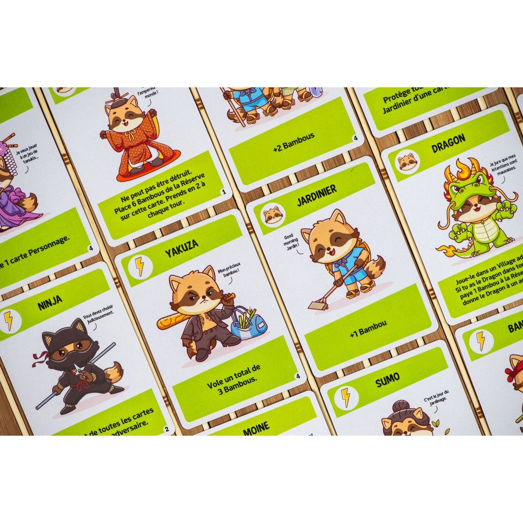 Joue des cartes "personnage" ou des cartes "action", applique leurs effets et récolte les bambous de ton jardin. Chaque carte personnage possède des capacités uniques. Te vengeras-tu de l'ennemi ou favoriseras-tu ton jardin ?