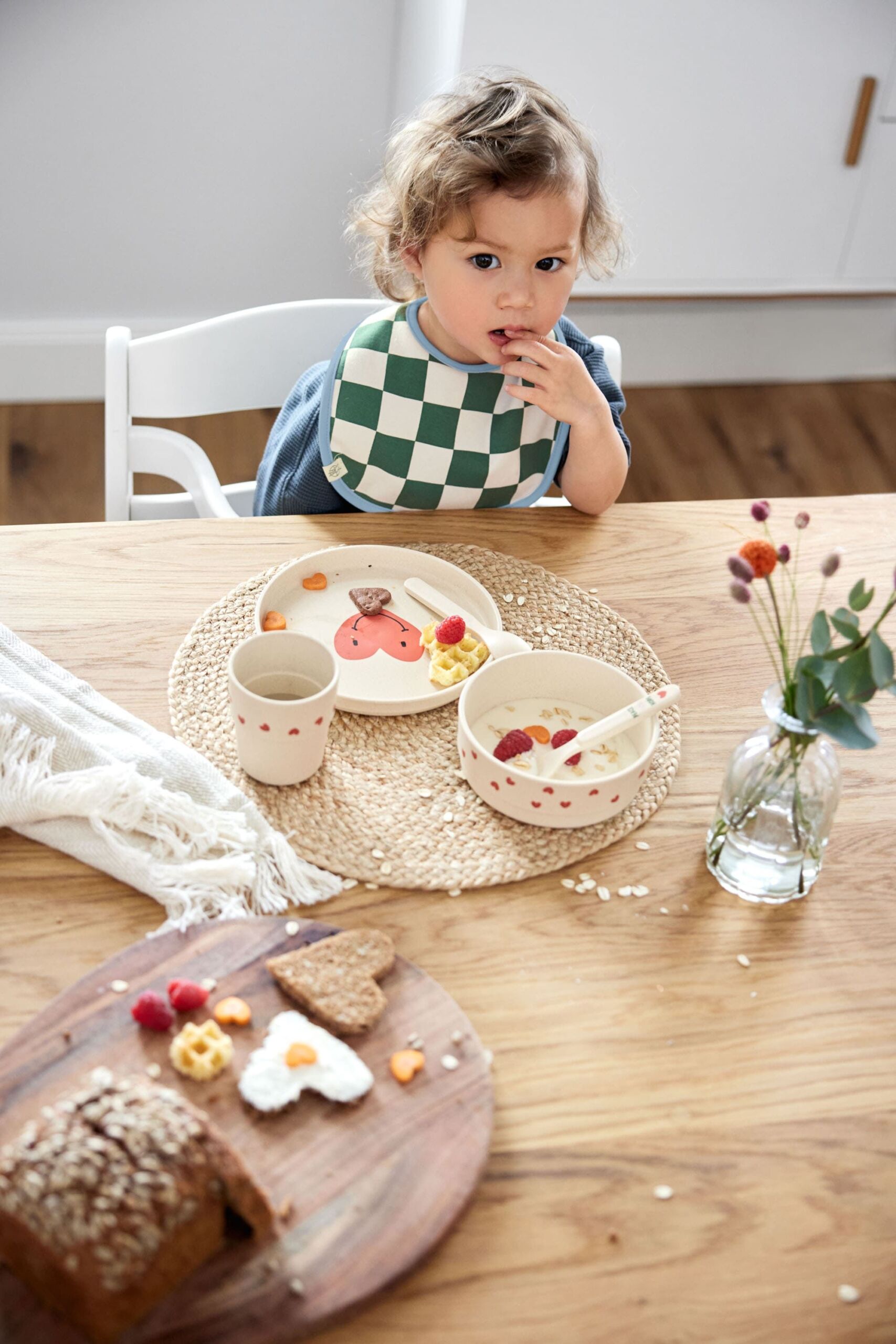 La vaisselle pour enfants de la collection Happy Rascals de LÄSSIG comporte également une tasse arc-en-ciel et cœur souriant.