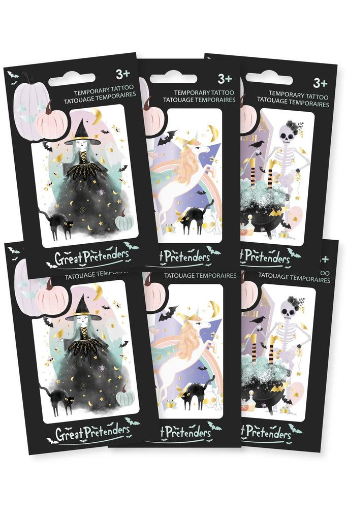 Les tatouages temporaires de la marque Great Pretenders sont le complément parfait aux costumes d'Halloween de vos enfants! Fabriqués avec des matériaux non toxiques, ces tatouages sont conçus pour être délicats sur la peau et faciles à appliquer et à enlever. Chaque paquet contient un tatouage pouvant représenter une sorcière, un squelette ou encore une licorne enchantée.
