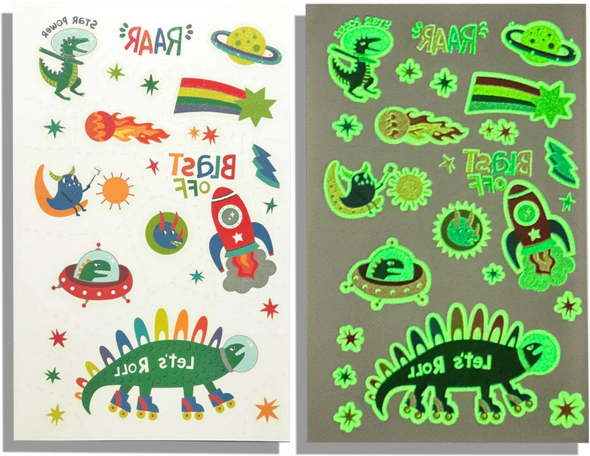 Transformez les moments de jeu en instants magiques avec les tatouages temporaires phosphorescents Tattoo-Palooza – Zero Gravity Dinos ! Ce lot de 3 planches de tatouages temporaires combine dinosaures et aventures spatiales, et brillent dans le noir pour une expérience hors du commun.