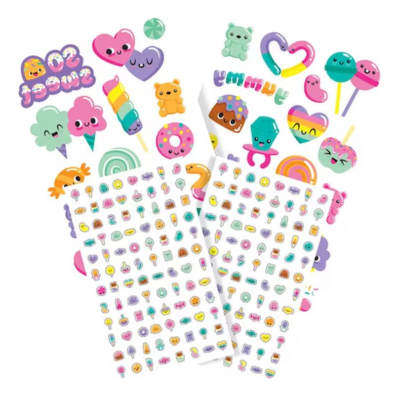 Une pochette qui combine des planches de tatouages temporaires et des stickers pour ongles joyeusement colorés sur le thème : confiserie.