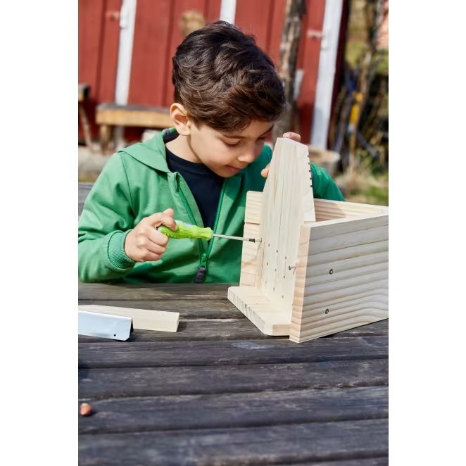 Ce kit d'assemblage rassemble tout le matériel nécessaire à la réalisation d'une mangeoire spéciale pour les écureuils.