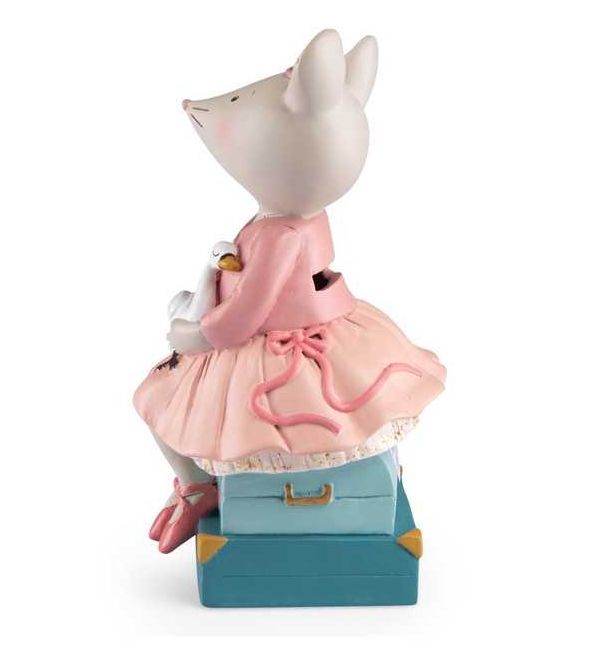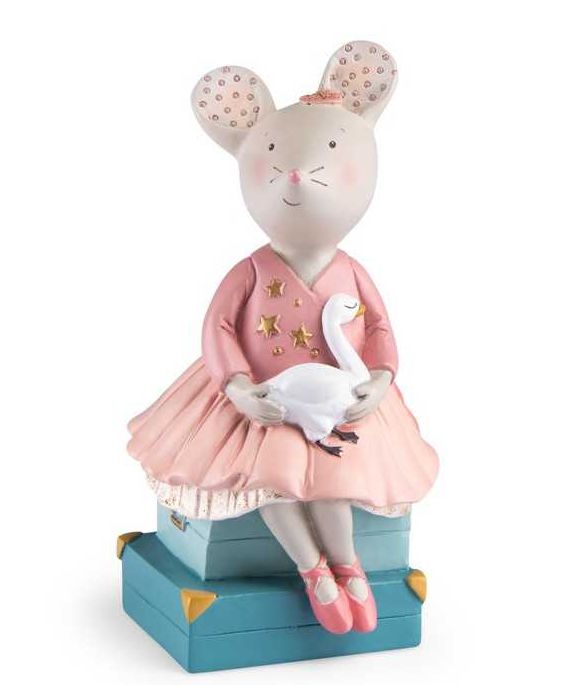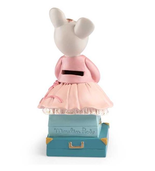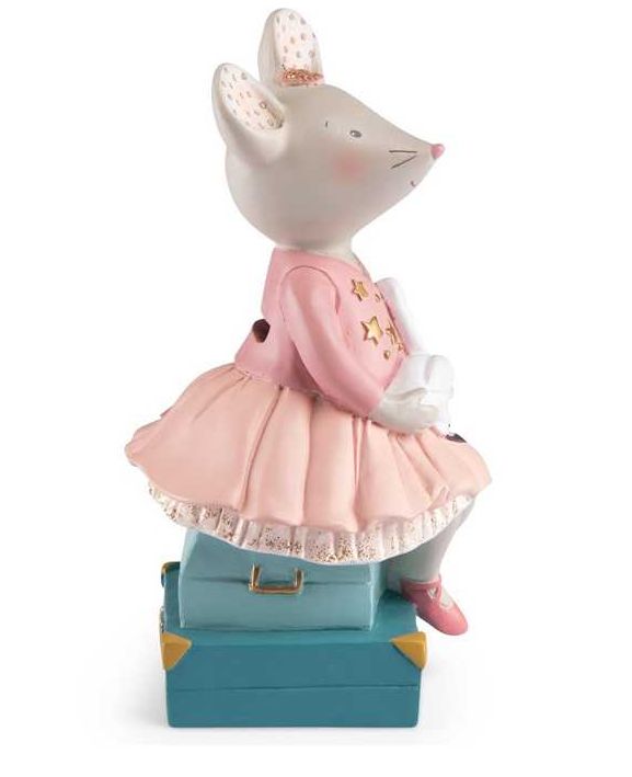 Découvrez la tirelire souris de la collection La petite école de danse de Moulin Roty, une jolie tirelire en résine en forme de souris assise sur des valise pour les enfants.