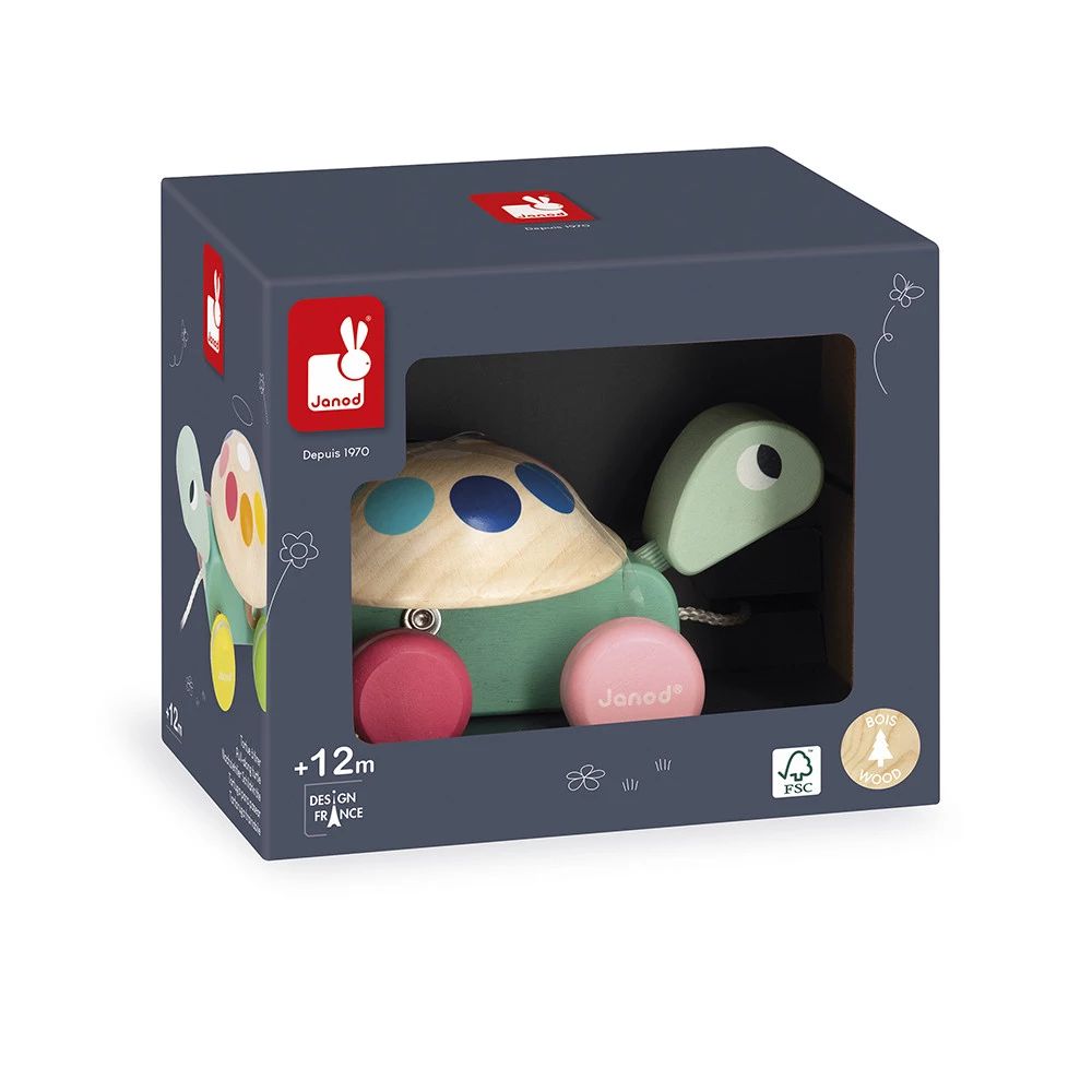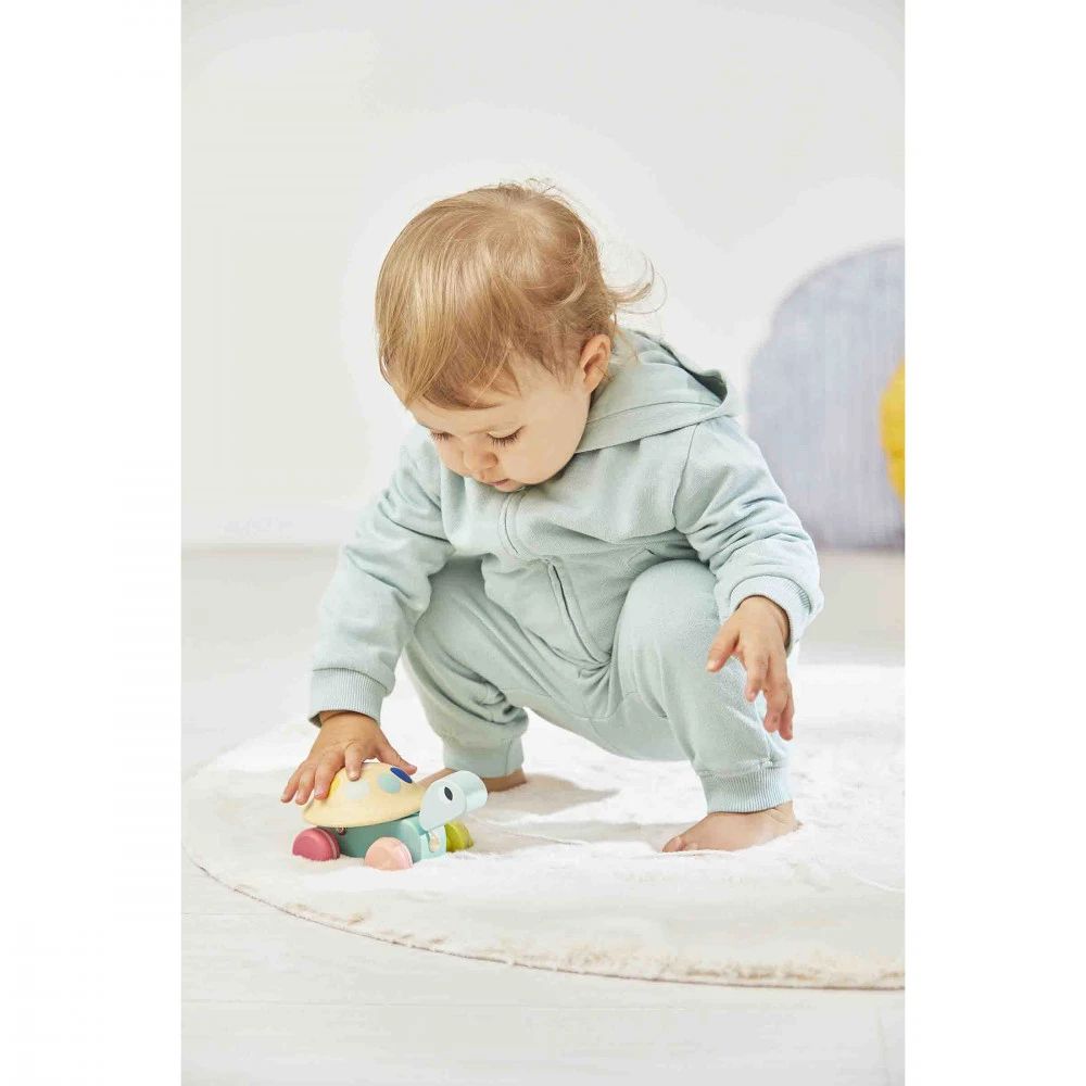 Jouet d'éveil à promener en forme de tortue de la gamme Zigolos. Lorsque que votre enfant promène sa tortue, les roues font tourner sa carapace aux jolies couleurs de l'arc en ciel. Les roues sont silencieuses grâce au caoutchouc antidérapant.