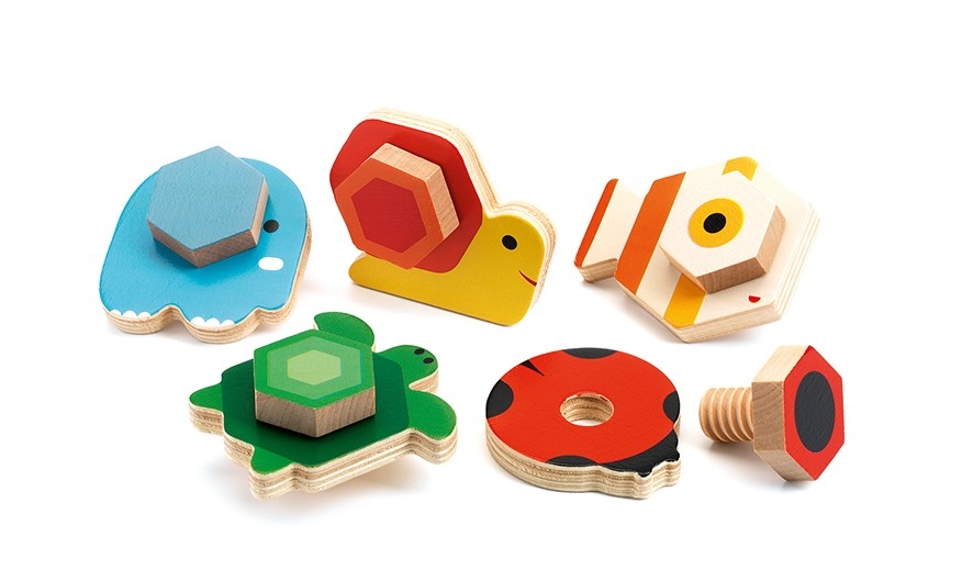 Tournabasic est un jeu en bois de la marque Djeco constitué 5 éléments à visser sur les animaux pour le plus grand plaisir des petits.