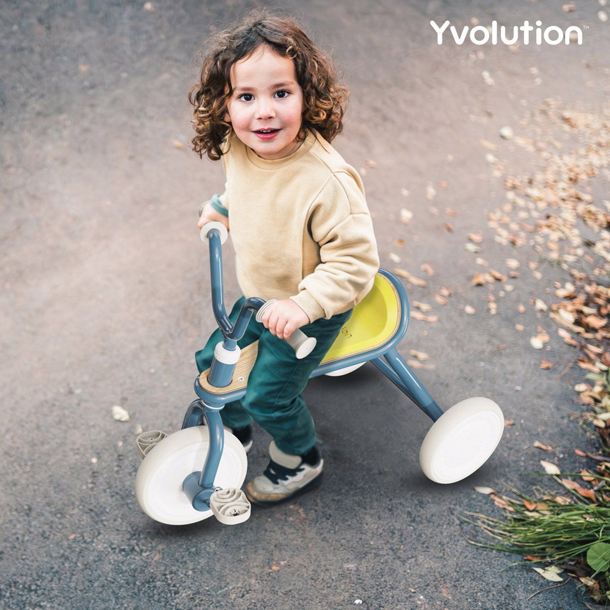 L'aventure peut commencer avec le tricycle Yvolution bleu !