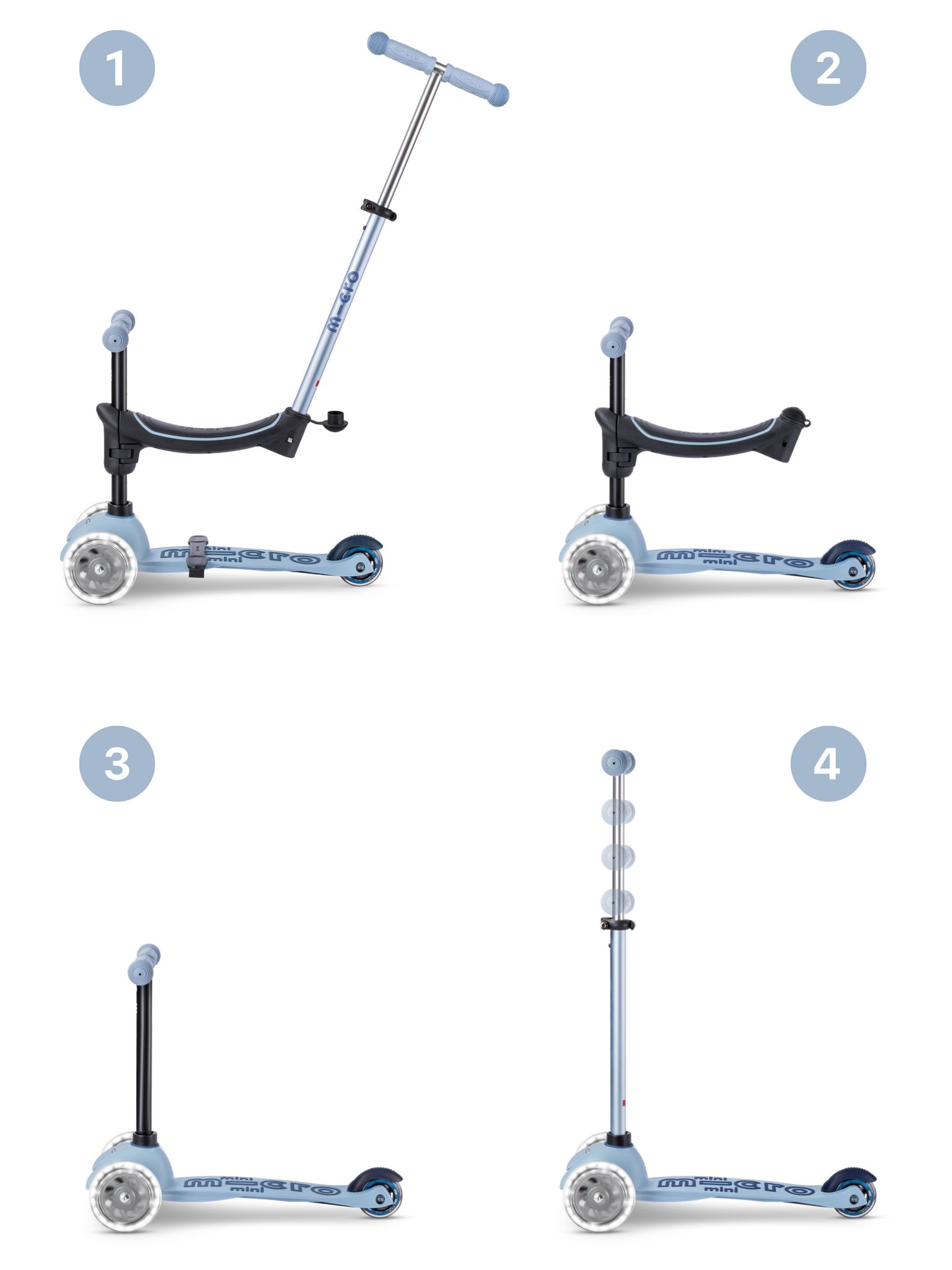 Le scooter 4-en-1 est innovant et ergonomique. Il peut être utilisé de différentes manières suivant l'évolution de votre tout-petit : d'abord assis sur le siège et poussé par les parents avec 2 options de repose-pieds, ensuite sans barre de poussée comme une draisienne et enfin sous forme de trottinette classique comme la Mini Micro Deluxe.