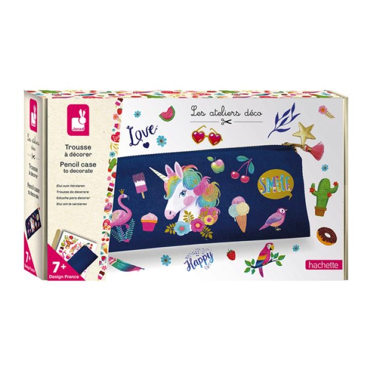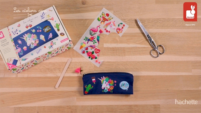 Contenu : 1 trousse de 17 x 7 cm, 1 planche de transfert,1 bâtonnet en bois, 1 breloque étoile dorée, 1 pompon rose fluo et 1 livret