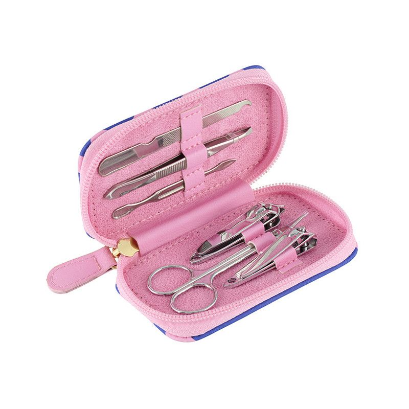 Contenu : 2 coupe-ongles, 1 paire de ciseaux à ongles, 1 lime, 1 pince à épiler et 1 poussoir à cuticules