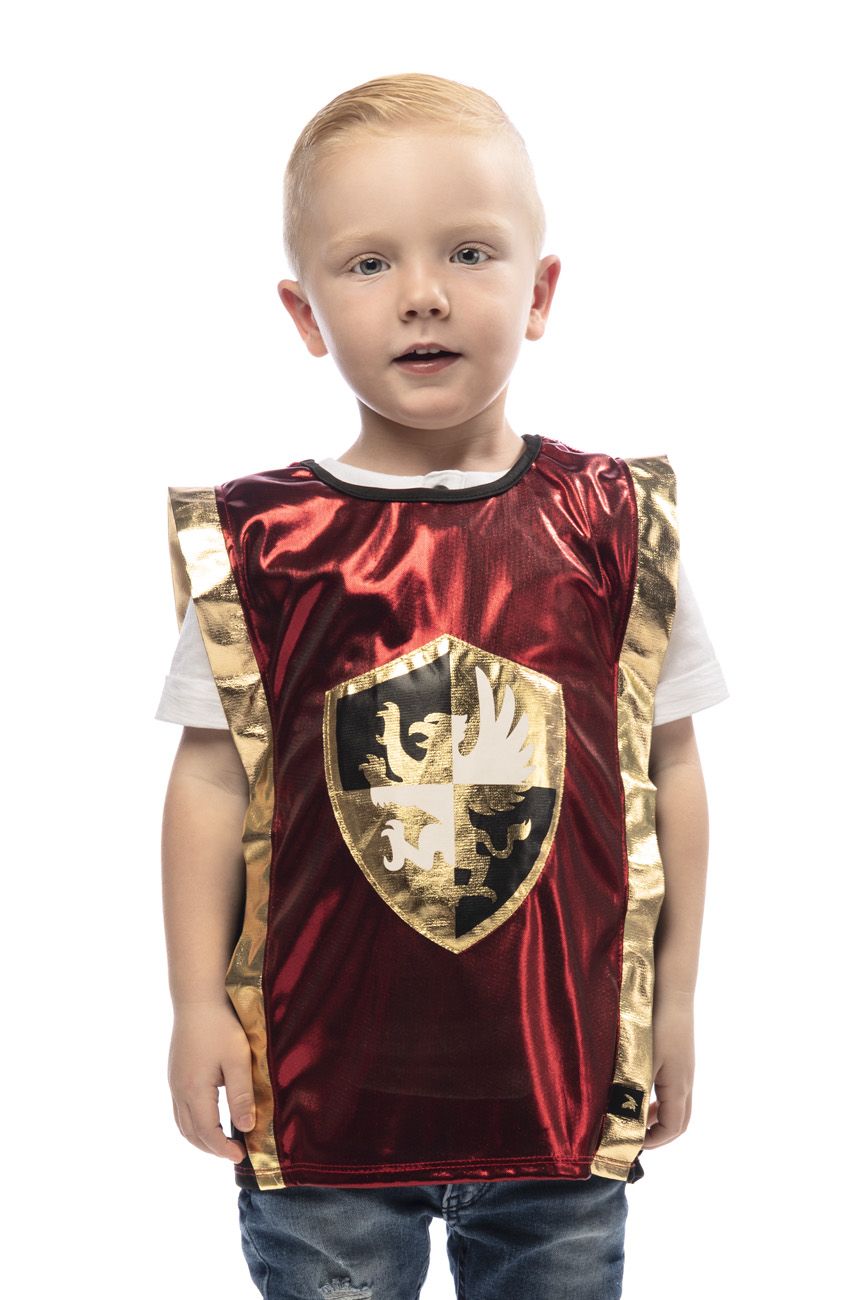 Un joli déguisement pour transformer les petits rêveurs en chevalier prêt à partir en croisade. L'avant de la tunique est fait de tissu brillant est orné d'un bouclier et d'un blason noirs et dorés. L'arrière est fait d'un joli tissu rouge satiné. Facile à