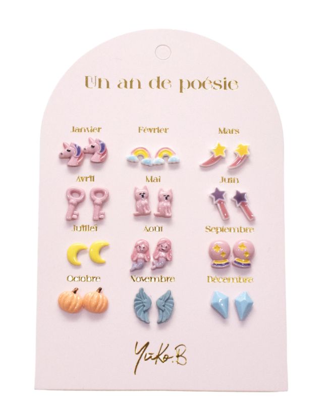 Une carte de 12 paires de boucles conçues spécialement pour les oreilles percées, chacune ornée d'un motif unique. Cette gamme vous permettra de changer de style au gré de vos humeurs tout au long de l'année et d'ajouter une dose de poésie à votre quotidien.