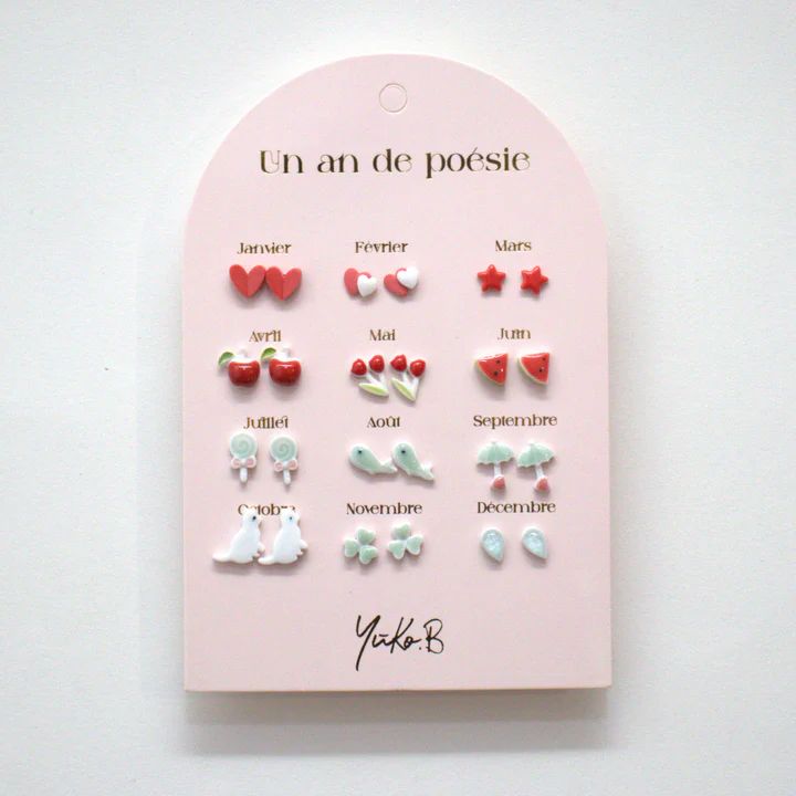 Une carte de 12 paires de boucles conçues spécialement pour les oreilles percées, chacune ornée d'un motif unique. Cette gamme vous permettra de changer de style au gré de vos humeurs tout au long de l'année et d'ajouter une dose de poésie à votre quotidien.