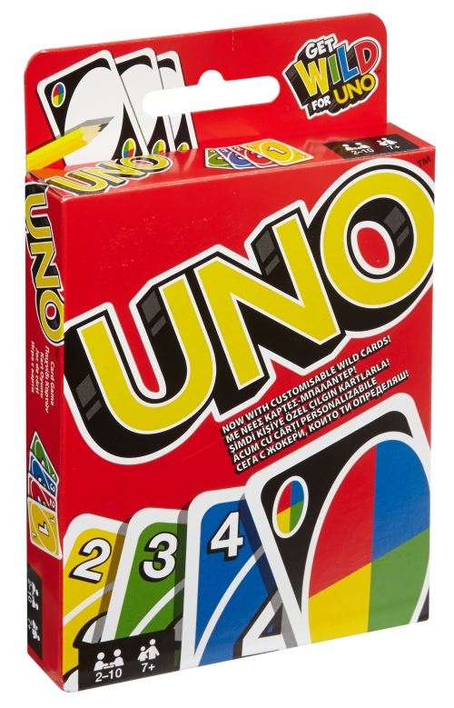 Uno ! Le célèbre jeu de défausse pour jouer en famille. Chaque joueur reçoit 7 cartes et on en place une face visible au centre de la table. Chaque joueur à son tour se défausse d'une carte de sa main qui a la même valeur, la même couleur ou le même symbole que la carte visible sur la table. S'il ne peut pas joueur il pioche. Quand un joueur n'a plus de cartes la partie s'arrête. Les cartes encore en main font marquer des points négatifs. Les cartes spéciales viennent pimenter le jeu.