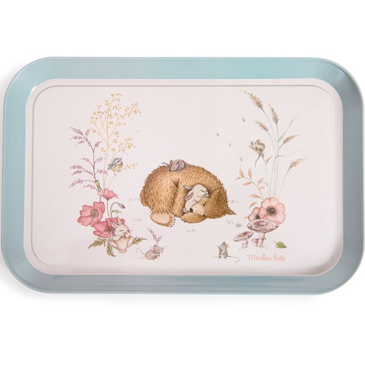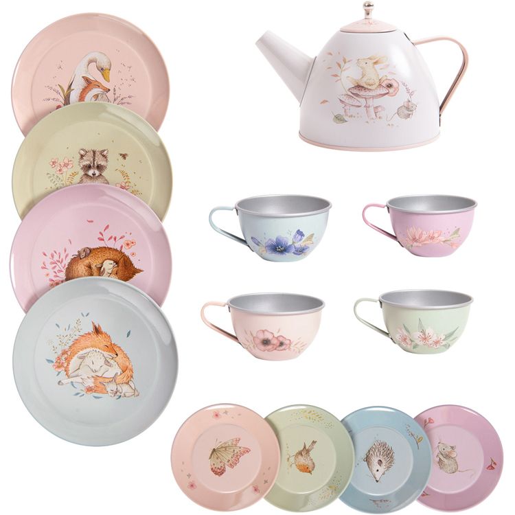 Une dinette en métal est illustrée avec les fleurs et les animaux favoris de nos amies les Rosalies. Elle comprend un plateau, une théière, quatre assiettes à dessert, quatre tasses et quatre soucoupes assorties.