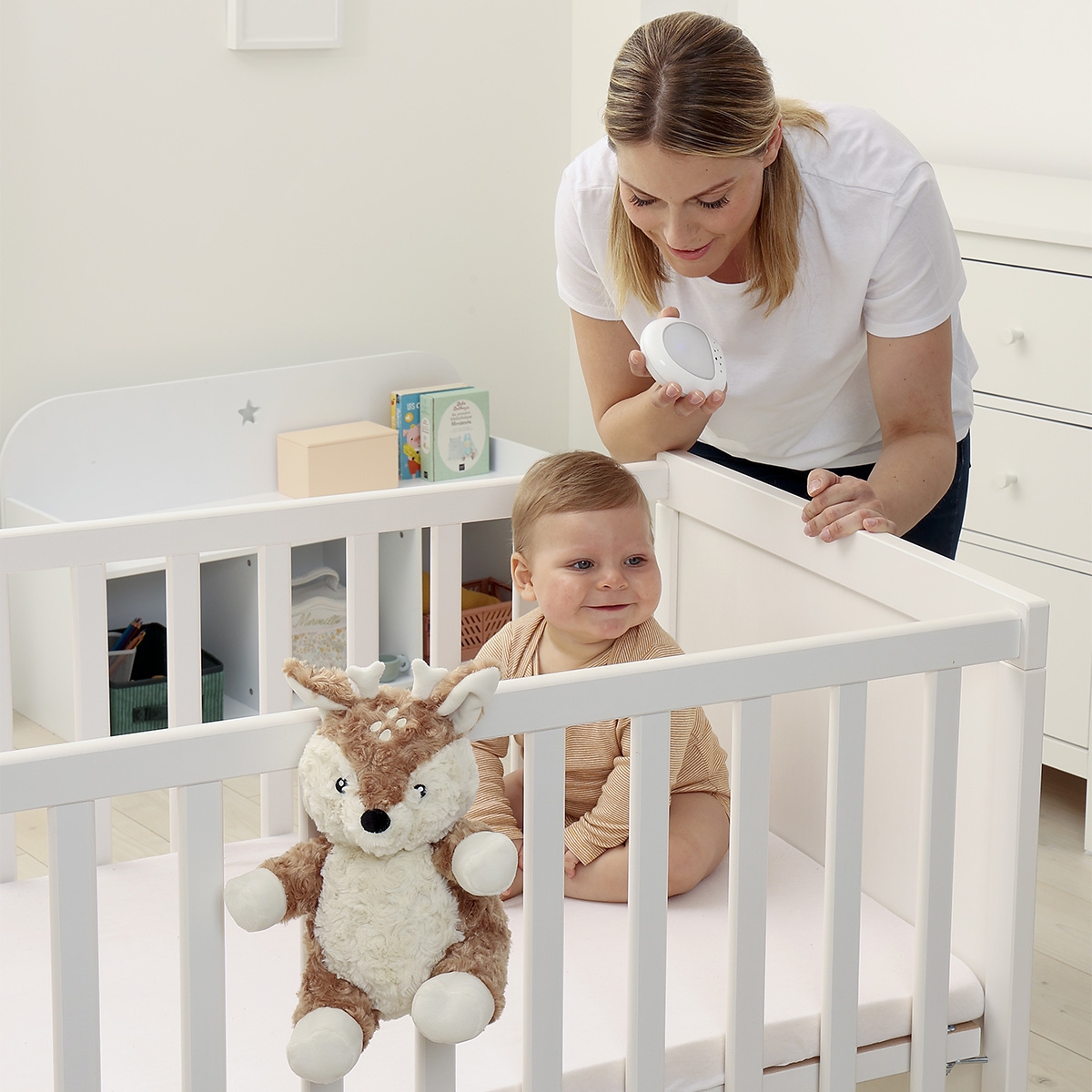 Cette jolie peluche en forme de faon propose de nombreuses options qui contribueront à générer naturellement un effet calmant : 4 sons apaisants/bruits blancs