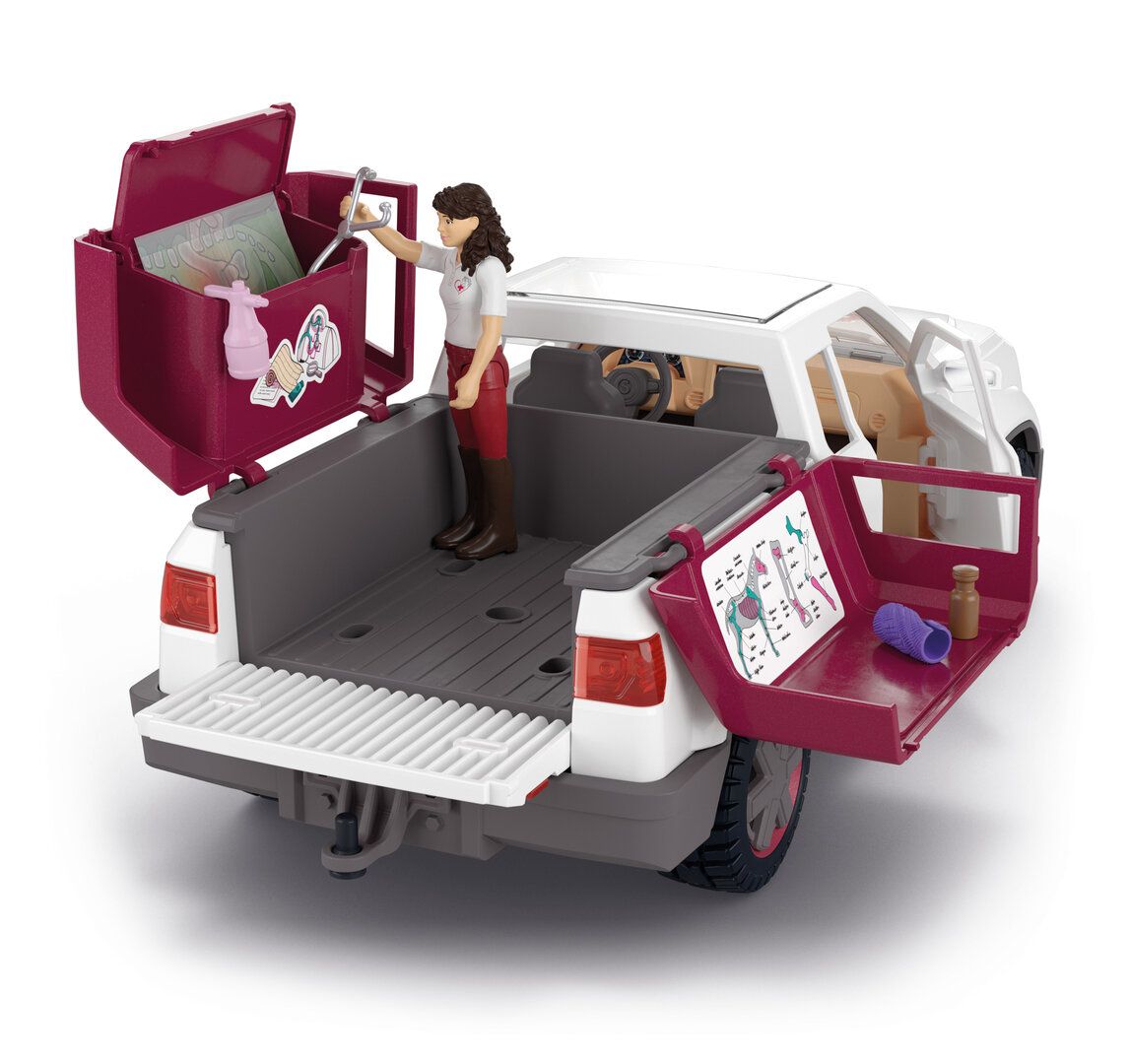 Contenu : 1 pick-up, 1 remorque, 1 figurine de Mme Kramer, 1 poulain Tennessee Walker, 1 appareil à rayons X, 3 radiographies, 1 pansement adhésif, 1 pommade, 1 vaporisateur, 1 flacon de médicament, 1 brosse de pansage, 1 botte de carottes, 1 licol de pansage turquoise, 1 notice de montage, 1 feuille d'autocollants.